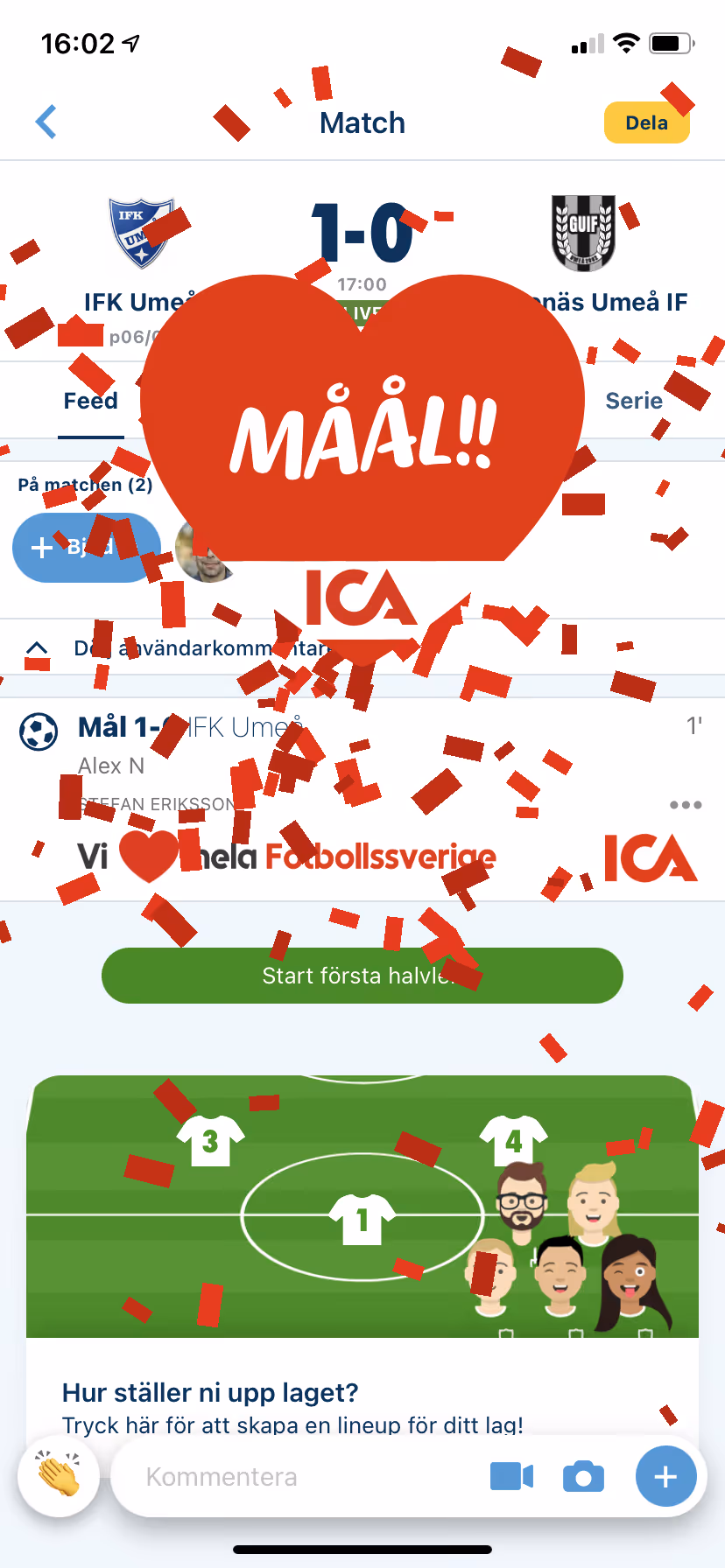 In partnership with the Swedish Football Association and Sportswik, ICA activated a dynamic digital engagement campaign through Min Fotboll. ICA became the goal partner for youth football, with every goal captured in the app celebrated by animated “confetti” graphics and the message “We ❤️ all of Football Sweden.” To localise the experience, ICA stores could connect to their local club within Min Fotboll, automatically triggering dynamic matchday branding such as “[Store Name] ❤️ [Club Name]” and removing the need to create individual assets for each store. This approach allowed ICA to scale a personalised, community-first campaign nationally, aligning the brand with real moments of joy across Swedish football.